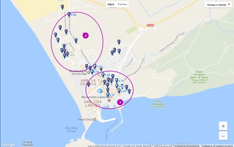 Если на оба пункта вы ответили "да", выбирайте апартаменты или отель в секторе, отмеченном цифрой "2". Это район современной застройки, протянувшийся вдоль пляжа Los Lances. Здесь сдается много апартаментов с видом на океан, и парковка не проблема. Мы снимали апартаменты с гаражом, но я не заметила большой проблемы поставить машину на ночь просто на улице. Прогулка от самого дальнего края до центра не займет более двадцати минут.