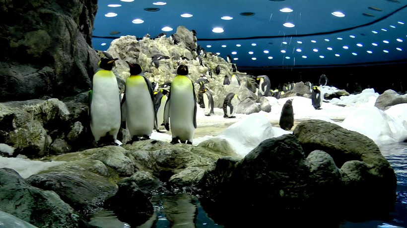 Далее вы попадаете к пингвинарию «Антарктида». В этой зоне всегда холодно внутри и пахнет рыбой. Так что берите с собой кофточки или легкие ветровки, иначе замерзнете. Пингвины, от маленьких до королевских, очень медлительны на поверхности, но частенько прыгают в воду, и тогда вы будете удивлены, как они быстро плавают под водой. Здесь они чувствуют себя прекрасно, ведь снежные пушки вырабатывают до 12 тонн снега ежедневно. Пушистые хлопья летают в воздухе, и на мгновение ты забываешь, что находишься в Африке.