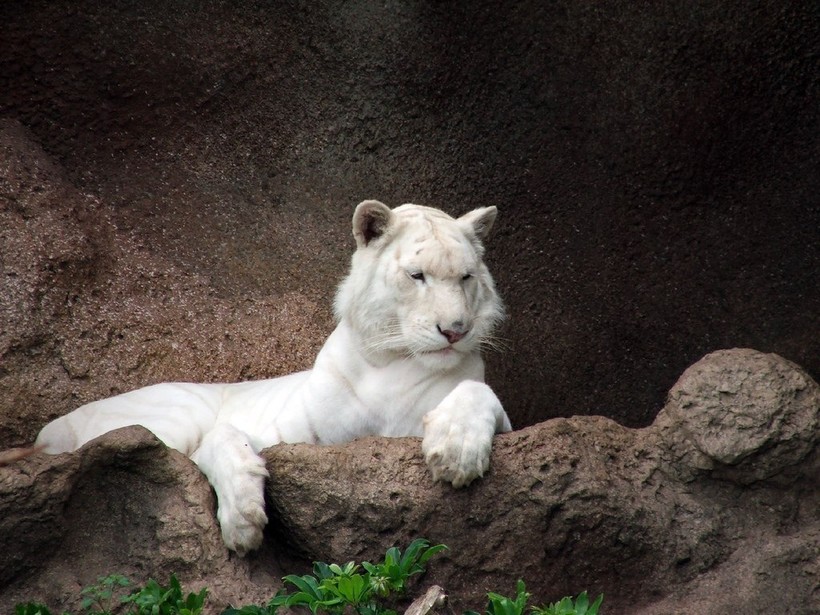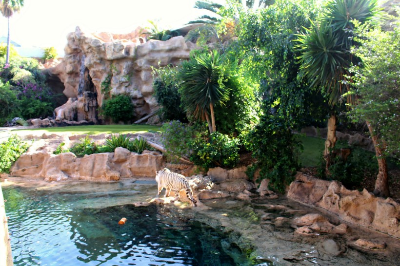 Белые тигры встретятся около океанариума, где живут косатки. У них огромные пространства, и они иногда с удовольствием позируют. К сожалению, я все время пробегаю мимо их зоны, но вижу царственно возлежащих зверей.