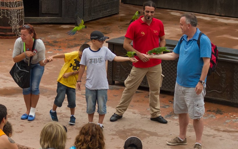 Долгое время шоу было самым популярным и знаковым в парке. Подойдет как для самых маленьких, так и для взрослых. В закрытом помещении вы сидите как в театре. Красивые яркие попугаи будут катать тележки, общаться с дрессировщиком и летать прямо у вас над головой. Вроде довольно простые развлечения, но поверьте, когда широкие крылья шуршат прямо над твоей макушкой – впечатлений более, чем достаточно.