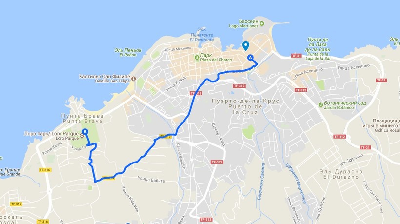 Тенерифе – остров небольшой, мы пересекали его от севера на юг примерно часа за полтора-два. Многие берут машины напрокат. Добраться до парка по указателям или навигатору достаточно легко. Расположен он на севере острова, возле столицы Пуэрто-де-ла-Крус. В самом городе полно указателей на Лоро-парк. Место на парковке около парка, естественно, легче найти ранним утром. Стоимость парковки — 4 EUR.