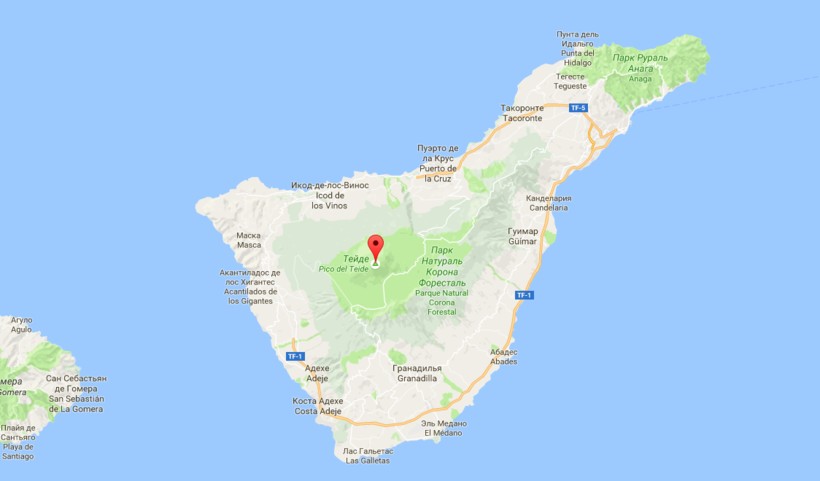 На карте отлично видно, что Тейде расположился практически в центре острова, зеленым обозначена территория национального парка.