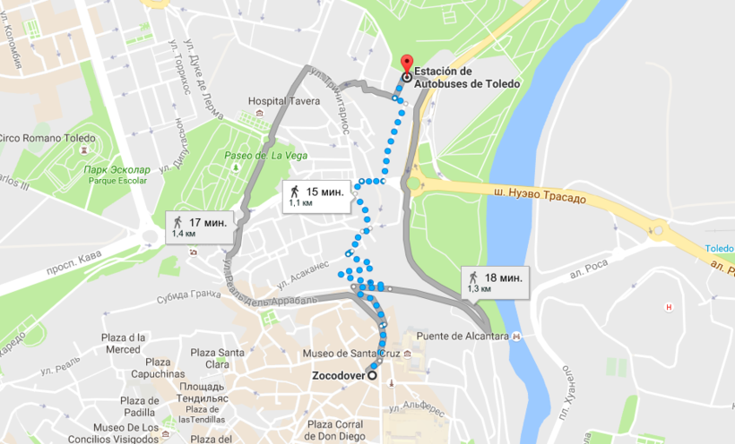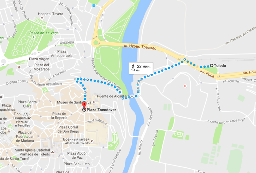 Вокзал Толедо расположен за пределами Старого города, так что прогулка до центра займет некоторое время. Зато по пути вы сможете полюбоваться видом на город и долину реки Тахо, пересечь старейший городской мост Алькантара (Puente de Alcantara) и осмотреть все улочки древнего Толедо.