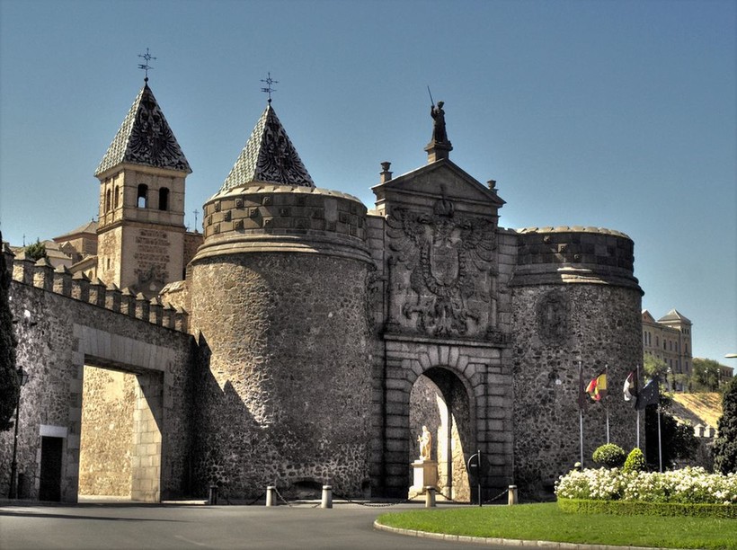 - Ворота Бисагра. Наверное, самые знаменитые ворота в Толедо. Классические городские врата XV–XVI веков. Две мощные симметричные башни по бокам, скульптура ангела-хранителя, двуглавый орел (символ королевской власти Габсбургов и герб города) — всё это типичные атрибуты парадных городских сооружений в средневековой Испании.