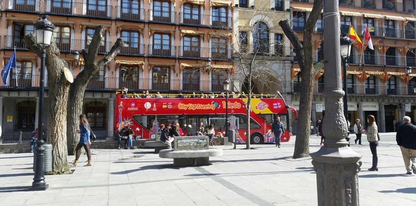 В Толедо есть несколько автобусных маршрутов, однако вы всегда можете воспользоваться красным туристическим автобусом, который курсирует между вокзалом и Старым городом. Проезд обойдется вам в 2 евро, зато вас доставят к подножию Алькасара, всего пара минут пешком, и вы на площади Зокодовер.