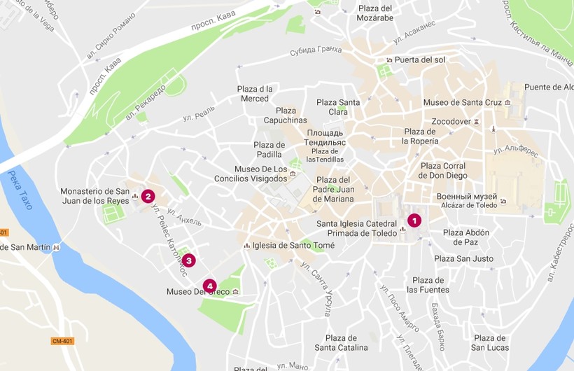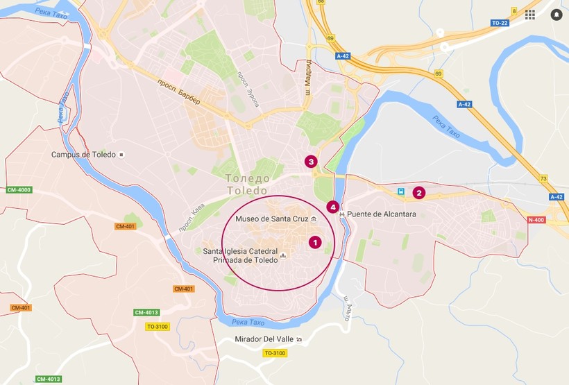 На карте, прикрепленной ниже, Старый город я обвела в овал, цифра 1 — дворец Алькасар, рядом с ним находится и площадь Зокодовер; цифра 2 — железнодорожный вокзал; 3 — автобусный вокзал, а 4 — старинный мост Алькантра и вход в Старый город Толедо.