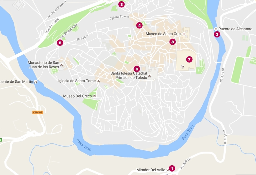Благодаря особенностями рельефа Старый город Толедо занимает крошечную площадь, поэтому, чтобы осмотреть все достопримечательности города никакой транспорт не нужен. Вы легко сможете обойти пешком все улочки, а также добраться до панорамных площадок, упомянутых в разделе «Топ-5».
