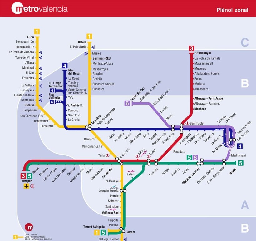 Обе линии домчат вас до центра города всего за 25 минут! Билет покупается в красном аппарате на входе, в котором можно выбрать английский язык (выбрать в меню Idioma и далее Inglés) и расплатиться наличными либо карточкой. Необходимо обратить внимание, что проезд до аэропорта считается как зона D и стоит 3.90EUR в одну сторону + 1 EUR за карточку. Если вы выбрали опцию «одинарный билет», аппарат сам выдаст вариант покупки билета до аэропорта, который и нужно выбрать. Тут я должна предупредить об очень важном моменте: не выбрасывайте красную карточку, которую выдаст аппарат! Во-первых, в метро Валенсии выход также осуществляется по карточке (то есть, надо ей пропиликать и на входе, и на выходе), а, во-вторых, это обновляемый проездной: когда вы будете покупать новые поездки на метро, ее нужно вставить в аппарат и выбрать функцию Recargar (если вдруг не найдете на английском) и уже дальше выбирать нужный тариф. Также хочу обратить внимание на то, что проездной до аэропорта чудесным образом обнуляется через 24 часа, поэтому не стоит брать билет обратно заранее и лучше пополнить карту перед выездом. Что касается расписания, в будние дни первый поезд из аэропорта отходит в 07.08 утра, а последний в 23.28, а в выходные с утра можно будет уехать в 05.47, а ночью в 23.47. Интервал между поездами составляет 10-15 минут. Надо сказать, что несколько раз я попадала в очень неудобные ситуации, когда поезд уходил у меня перед носом и приходилось ждать следующего 20мин, поэтому хочу обратить внимание, что метро Валенсии ходит по расписанию, поэтому стоит заранее спланировать поездку и ознакомится с расписанием на сайте Metrovalencia. В остальном метро Валенсии – это довольно удобный и приятный способ передвижения, на всех станциях есть планы, удобные табло и повсюду весят указатели с направлением выхода (salida) и переходом на другую ветку.