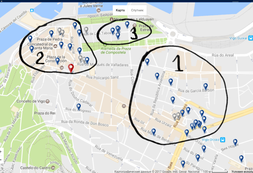 До посадки в автобус в 10 утра или уже на обратном пути, после возвращения, можно подняться выше и посмотреть Старый город, собор Санта-Мария-де-Виго, спускаясь вниз рынок La Pedra, где можно купить сувениры, отель Bahia de Vigo,побывать на улице устриц и Осьминогов, и на Морском вокзале.