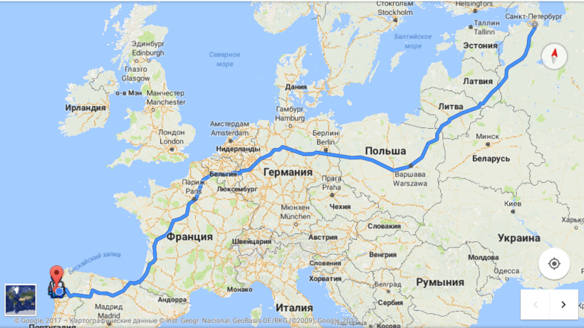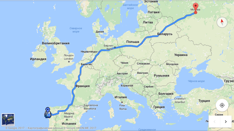 От Москвы до Виго 4398 км, при этом придётся пересечь Белоруссию, Польшу, Германию, Бельгию, Францию.