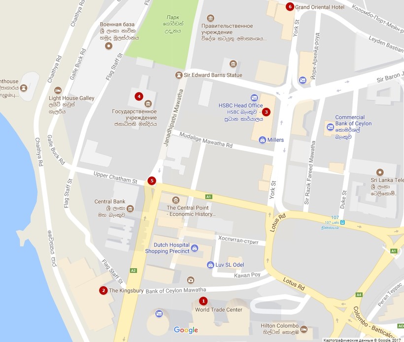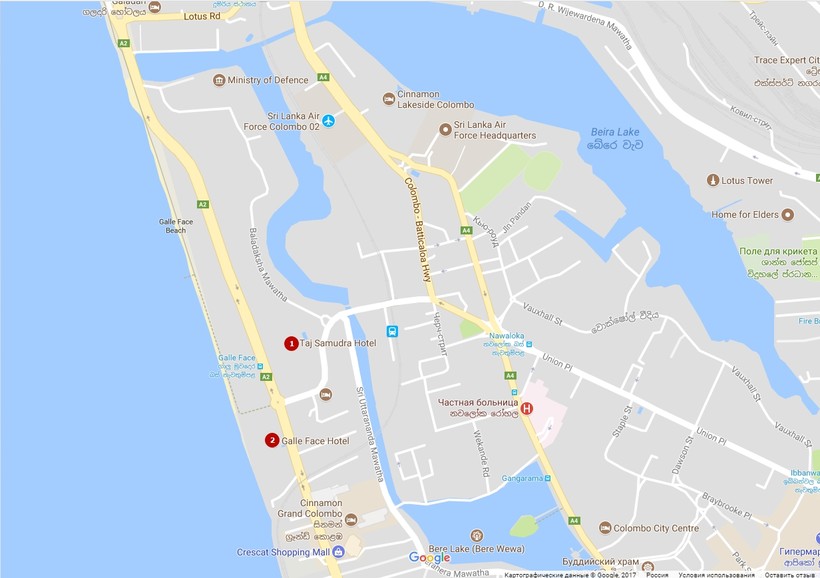 - 1 – районы Форт, Галле Фрин Фэйс, Коричные сады, озеро Бейра. Здесь в основном находятся дорогие гостиницы класса люкс, отели 3-5*. Цена за номер – от 65 USD (10000 LKR) и значительно выше.