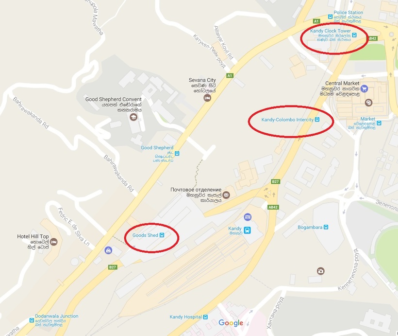 Он, как и другие междугородние маршруты, приходит в Канди на главный автовокзал города (остановка Goods Shed, на карте ниже), расположенный рядом с железнодорожным вокзалом. Примерная стоимость билета – 1 USD (155 LKR). Время в пути – около 3,5 часов.