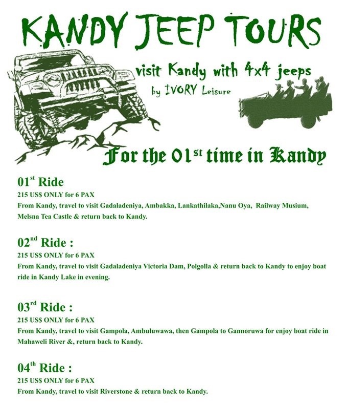 В Канди приезжают ради достопримечательностей, однако помимо культурного отдыха можно найти и что-то развлекательное. Например, Канди – 2й город в Шри-Ланке после Коломбо, а значит есть возможности для хорошего шопинга. А если вы любитель активного отдыха, отправляйтесь в джип-тур по окрестностям.