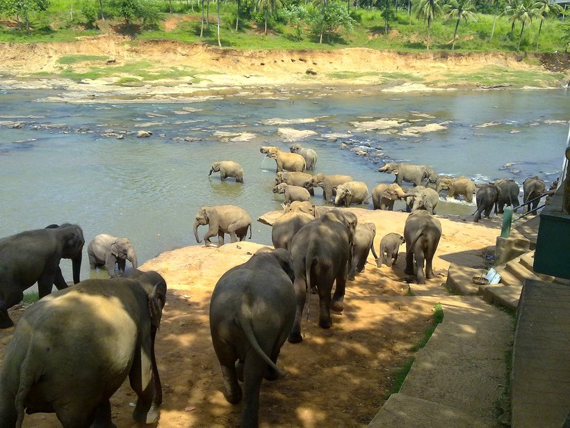 Однако, не будем о грустном! Слоны в Пиннавеле произвели на меня потрясающее впечатление — милые, добрые, улыбчивые! И, самое главное, то, какие зрелища предлагает этот питомник. Если приехать туда утром, можно покормить малышей-слонят молочком из бутылочки, а потом пройтись вместе со всем стадом из 90 слонов до реки, где они купаются и резвятся. Зрелище это, кстати, просто обалденное! Целое стадо ведут через весь поселок к реке Маха Ойя, где дети-слонята резвятся и плещутся в воде, а взрослые омывают себя дождиком-фонтаном из хобота.