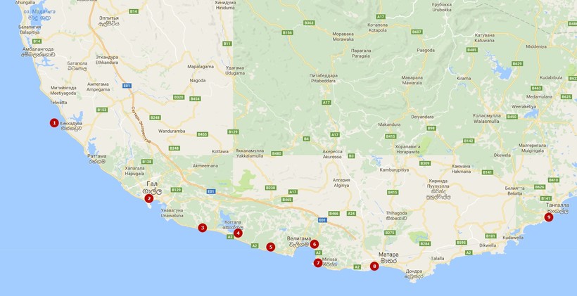 - Совсем начинающим больше подойдет Велигама (Weligama, цифра 6 на карте) с её легким входом, песчаным дном и приятными раскатистыми волнами. Недаром здесь располагается множество серф-школ, в том числе и русская.