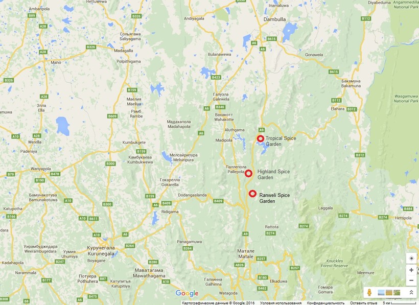 - Highland Spice Garden (№ 25). Адрес: Koholanwela Madawala Ulpatha, Matale. Сад больше ориентирован на организованные группы туристов. Есть свой ресторан.
