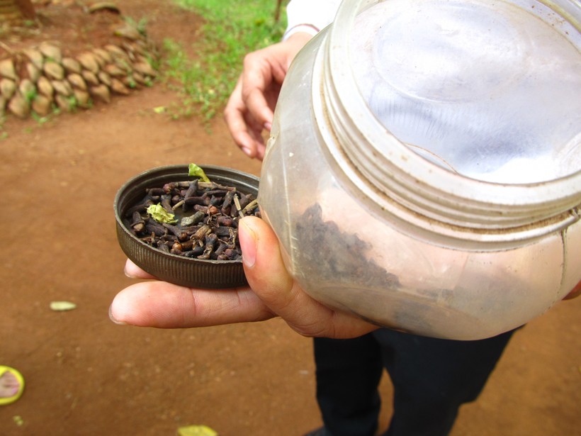 - Гвоздика. Для нас, выросших в СССР, – это, прежде всего, красный цветок, который символизирует революционную борьбу. Гвоздика же как специя, имеет маленькие плоды в форме сапожных гвоздиков, которые получаются в результате высыхания цветочных бутонов гвоздичного дерева. Изготовление гвоздики – достаточно простой процесс, поэтому стоимость ее невелика. Как выяснилось, гвоздика в порошке – практически бесполезный продукт, по-настоящему ценны только плоды, содержащие масло. В рамках "аттракциона", который показывает гид, вы можете увидеть главное отличие качественной гвоздики – она должна тонуть! Именно это говорит о том, что пряность полна целебным эфирным маслом, без которого гвоздика теряет свою пользу. В основном используется гвоздика в кулинарии, в частности в консервировании, а также в медицине – для изготовления противопростудных мазей и бальзамов (с использованием гвоздичного масла), а также в качестве компонента пломб в стоматологии.