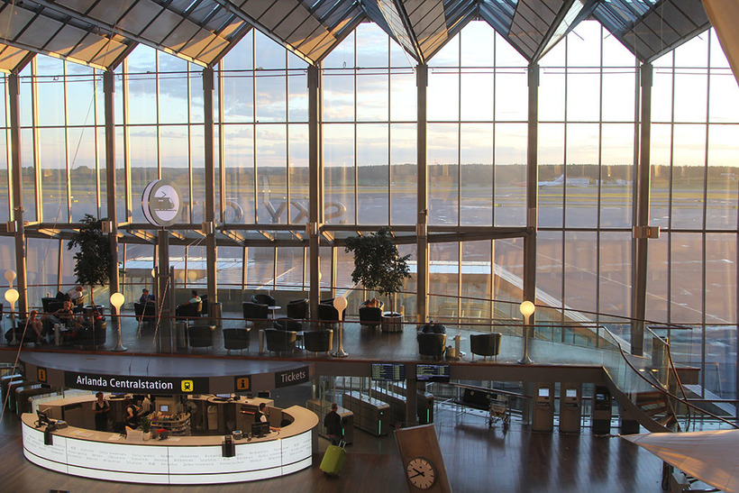 Аэропорт Арланда (куда мы прилетаем из России) расположен в 37 км от Стокгольма, ежегодно он принимает 20 миллионов пассажиров, всего в аэропорту 5 терминалов. Из аэропорта можно сесть на скоростной поезд, и спустя 20 минут мы будем в городе. Или взять билет на 583 автобус, доехать до Марста, а там сесть на поезд до Стокгольма.