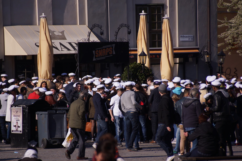 Гуляя с мужем 30 числа по городу, в центре мы наткнулись на огромное количество людей в белых фуражках. Сначала мы думали, что это в честь дня рождения короля, но, как выяснилось, всё куда проще — это гимназический выпускной. У нас платья и костюмы, а у них — белые фуражки. А ещё выпускной здесь отмечают целый месяц, так что в Стокгольме и в мае легко можно наткнуться на такую толпу гимназистов.