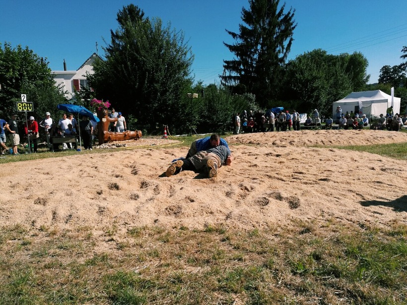 Представляет она собой смесь вольной борьбы, греко-римской борьбы и прочих боевых искусств. Участники борются друг с другом в таких вот тканевых, а именно джутовых штанишках. Самое интересное, что цвет этих штанов зависит от места, которое представляет борец: базельцы выступают в более светлых модельках. Проводится чаще всего в конце лета, в августе. Всё действие происходит на засыпанной опилками арене.