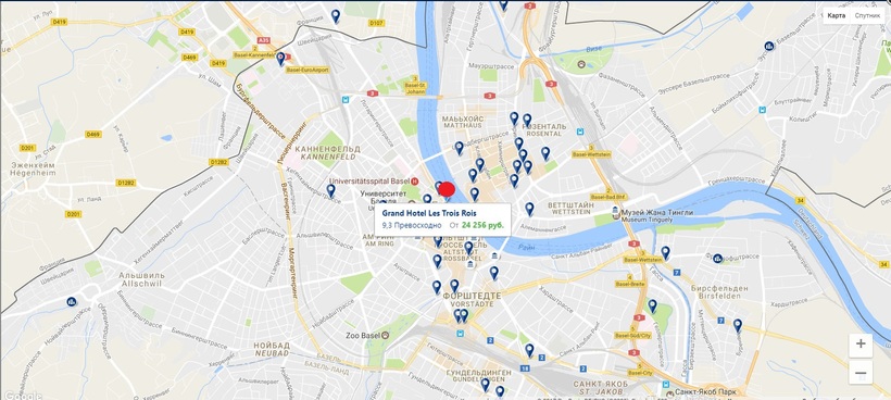 От этого места веет пафосом, элегантностью и шиком, а из его дверей выходят лишь люди в брендовой одежде, вечерних платьях и смокингах. Цена вопроса соответствующая: в среднем двухместный номер обойдется постояльцам в 514–589 EUR (550–630 CHF) за ночь! Но какие же там виды... Шаговая доступность от городской Ратуши, основные достопримечательности обоих старых городов (в Базеле есть малый и основной старый город) — мечта и сказка для каждого путешественника.