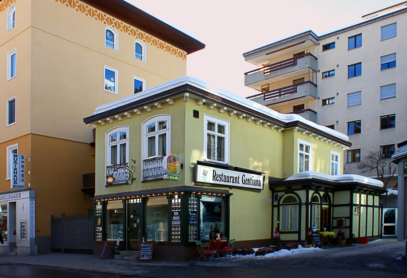 Ресторан/Бистро Gentiana (Restaurant/Bistro Gentiana), Promenade 53, тел. +41 081 413 5649. Небольшой ресторан на главной магистрали Давоса недалеко от большинства отелей. Специализируется на блюдах местной кухни (фондю и региональные блюда). Интересная и качественная подача еды. Небольшое атмосферное кафе с внимательным персоналом. Достаточно приятные, умеренные цены (примерно 160 швейцарских франков за ужин на двоих с вином).