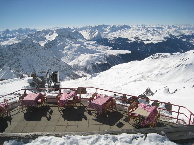 Ресторан 'La Terrasse' Turmhotel Victoria, Alte Fluelastrasse 2, Graubunden, Davos Dorf, тел. +41 81 417 5300. Ужин в великолепном зимнем саду с фантастическим видом на пейзажи Давоса. Прекрасный выбор мяса и фондю, атмосфера любезности.