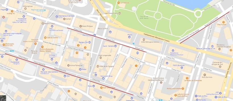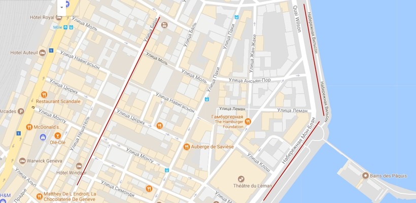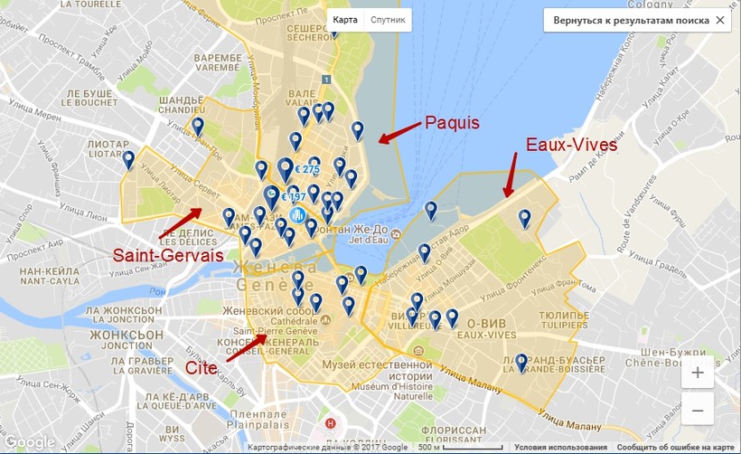 Если мы откроем карту на сайте Букинг, большинство отелей Женевы сконцентрированы в следующих районах: