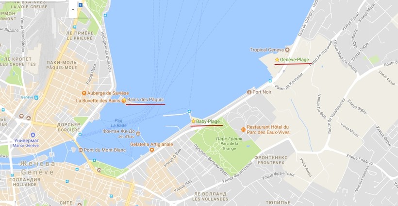 Пляж Bains des Paquis– это огромный пирс со спусками в воду, сауной или хамамом, спортивными площадками, рестораном и другой полезной инфраструктурой. Пляж открыт ежедневно, стоимость составляет 1,8 EUR (2 CHF) для взрослых, 0,9 EUR (1 CHF) для детей младше 16 лет.