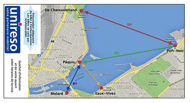 С одного берега озера на другой в черте города можно переправиться на речных трамвайчиках, которые входят в систему общественного транспорта. Это отличный способ покататься по озеру за небольшую сумму. Правда, маршрутов немного, всего четыре: M1: Pâquis- Molard, M2 Pâquis – Eaux-Vives, M3 Pâquis – Genève-Plage / Port Noir, M4 Genève-Plage / Port Noir – de Chateaubriand.