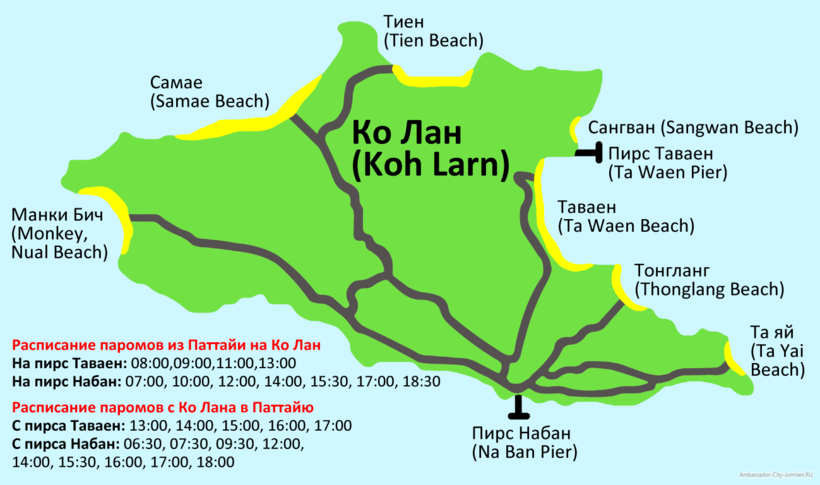 Нужно знать, что пляжей на острове несколько, как говорилось, Ко Лан достаточно велик, рейсов паромов два и они идут к разным причалам. Расписание паромов на Ко Лан доступно в сети, первый паром отправляется рано утром, в 7-00 и 8-00, далее они отходят периодически с разницей в 40-5о минут. Расписание обратно с причалов Ко Лана также предусматривает периодичность отправки паромов, последние стартуют в 17-00 и в 18-00. Готовьтесь в пути провести порядка часа.