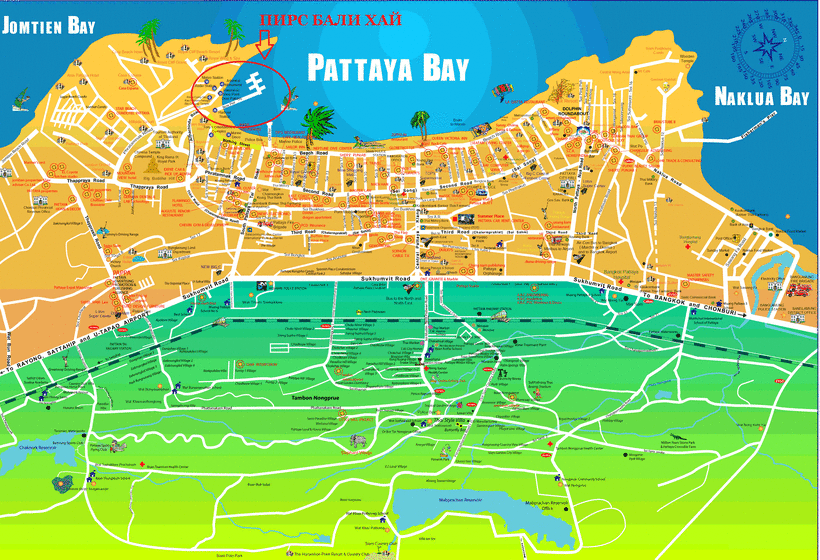 Далее ищем пирс Бали Хай, от которого стартуют паромы на Ко Лан, он находится в самом конце Уокинг стрит. А Уокинг стрит расположена в конце Бич роад, то есть, если идти по набережной в строну букв Pattaya, которые не заметить просто невозможно, то обязательно упрешься в начало Уокинг стрит. Определить, что находишься в нужном месте легко, здесь всегда много туристов. Но утром и днем, конечно, спокойнее. Вся набережная очень продолжительная, поэтому лучше до Уокинг стрит доехать, стоит это всего 30 центов, 10 бат. Добраться до самой набережной тоже не проблема, синий тук (открытый автобус, поездка на котором обойдётся во всё те же 30 центов, 10 бат), идет до набережной, тормозить его можно в любом месте улицы, а определиться, в какой стороне море можно, спросив прохожих, среди них обязательно окажутся и соотечественники, или же вы можете просто внимательно приглядеться, из многих мест города вид открывается хороший.