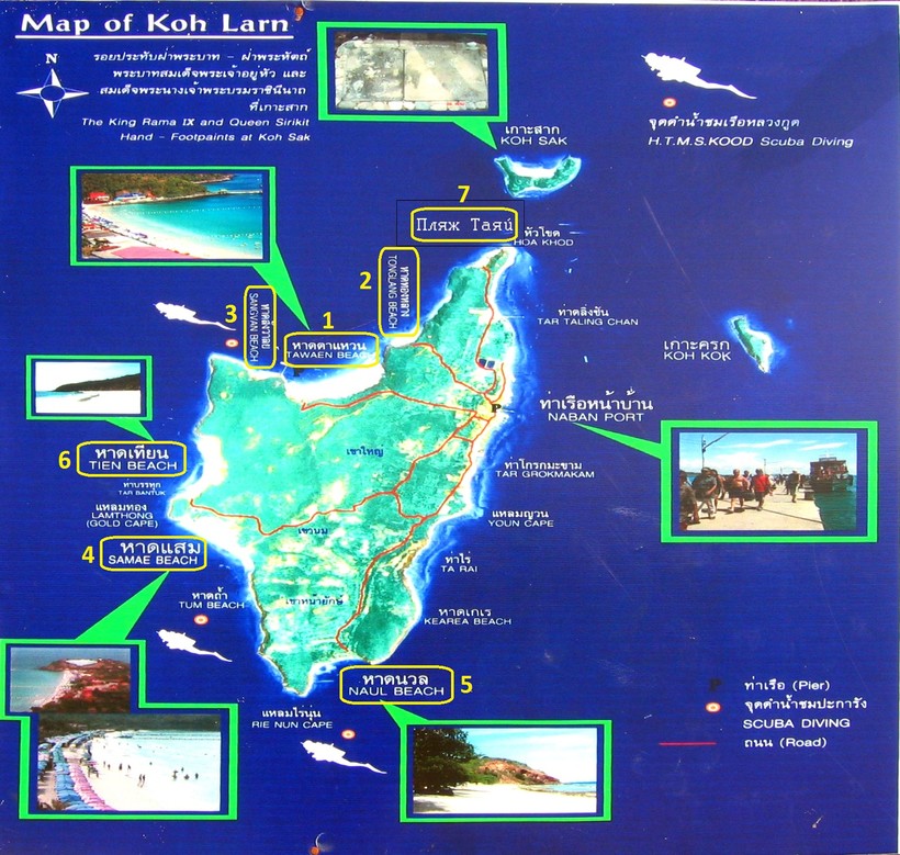 До пляжей от причалов ходят туки, но маршруты на них не обозначены, разумеется. Лучше запастись картой острова, чтобы уже достоверно определить, где Вы находитесь и куда поедите. Взять карту можно у торговых точек в городе, правда, придется поискать, особенно много их в районе Джомтьена. Можно спросить у водителей или туристов, где же находиться желанный пляж.