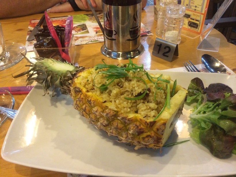 Рис в ананасе. Некоторые блюда, даже рис с овощами или морепродуктами иногда подаются в ананасах. Рекомендую попробовать!