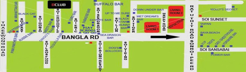 На самой Bangla road вы найдете: Клуб Seduction (самый знаменитый на Патонге) рядом с Soi Vegas (вход платный, флаеры раздают на Bangla road; флаеры на бесплатный вход только для девушек, мужчинам даже с флаером придется заплатить 300 батов). А еще вы найдете здесь стриптиз-клуб Moulin Rouge (русский). Также слева множество разрекламированных клубов: Banana Disco (вход – 500 батов), Climax, U2 и многие-многие другие, которым и названия-то нет.