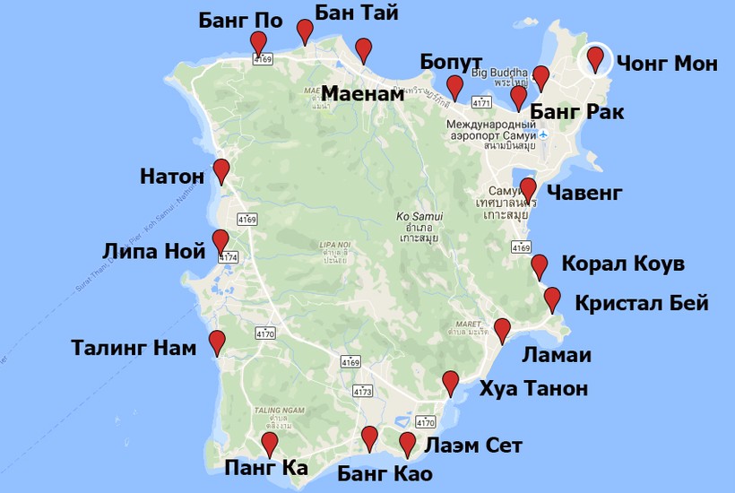На карте ниже я отметила основные пляжи Самуи.