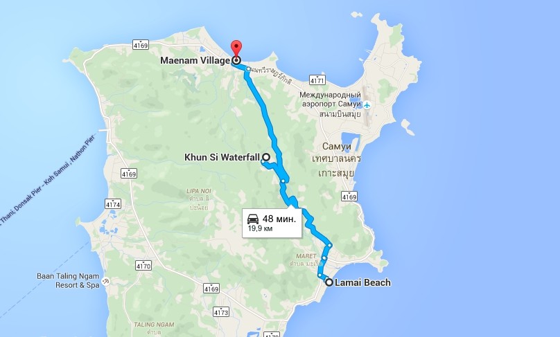 С главной дороги нужно свернуть вглубь острова вот в этом месте 9.450718, 100.000694. А дальше по всему маршруту будет много табличек с указателями, так что не заблудитесь. Сам вход на территорию водопада расположен вот здесь: 9.50972, 99.98917.
