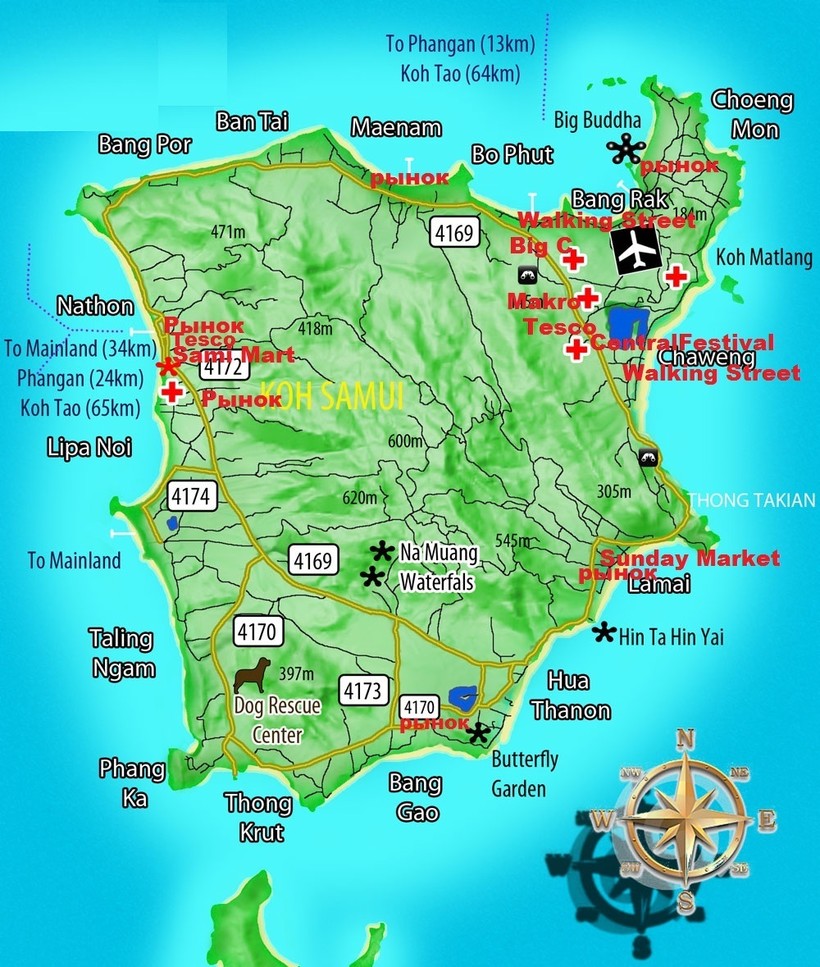 В почти каждом районе острова Самуи находится Tesko Lotus, Big C и Makro – крупные торговые центры, в которых можно купить любые вещи, в том числе редкие, европейского производства предметы обихода, косметику, ювелирные изделия, одежду, игрушки, товары для плавания, бытовую электронику, сотовые телефоны, компьютеры и многое другое. Хорошее качество всех продуктов, цены стандартные для туристов. Но здесь бывают распродажи фруктов и оптовые цены при покупке большим объемом. Эти торговые центры служат для того, чтобы обеспечить все потребности туристов острова Самуи.