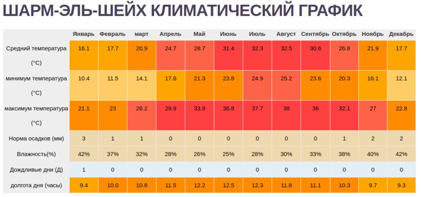Шарм-эль-Шейх — курорт с субтропическим климатом, характерным практически для всей территории Египта. Преимущество таких климатических условий — отсутствуют резкие перепады температур, нет большого количества осадков. Дождливой погоды на курорте практически нет, ноябрь / декабрь — период, когда в Шарм-эль-Шейхе могут идти кратковременные дожди.