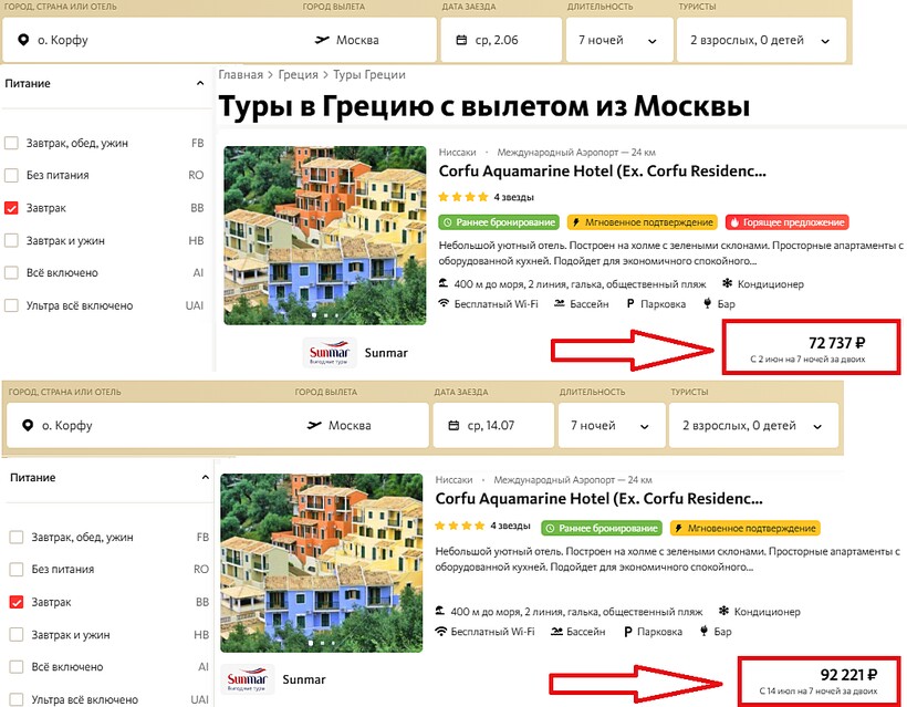 По демократичным ценам можно купить путевку на Керкиру на начало высокого сезона (конец мая — первые числа июня), когда море прохладное. На 7 ночей тур на Корфу с авиаперелетом, проживанием в отеле 4* с завтраком обойдется на двоих взрослых от 73 000 ₽. С середины июля отдых в гостинице данной категории будет стоить от 92 000 ₽.