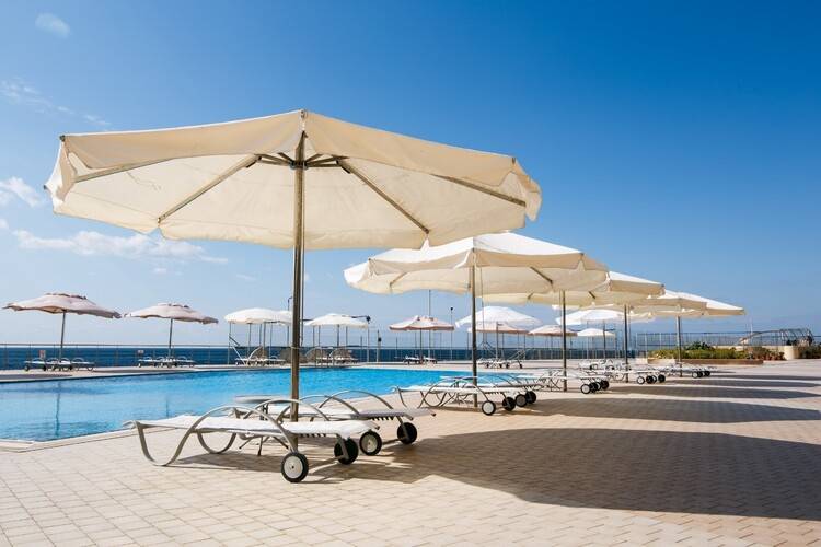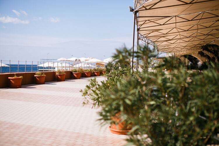 - Пляж: собственный каменистый пляж-платформа в 20 м от отеля (1 береговая линия). Шезлонги, зонтики и теневые навесы: бесплатно.