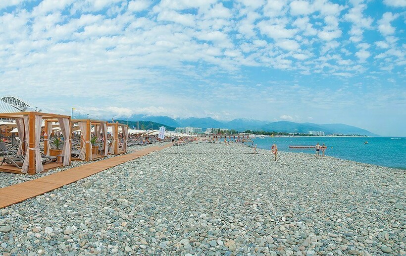«Розе Хутор» принадлежит кусок галечного пляжа на Имеретинской набережной, который даже получил «Голубой флаг». Всех гостей курорта на море и обратно возит бесплатный автобус. Пляж обладает развитой инфраструктурой: