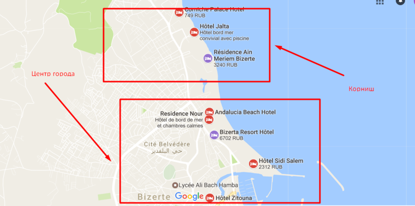 Отелей в городе не так и много. Бизерта — это не туристический город. Гостиницы можно пересчитать быстро. Все они расположены в центре города или в районе Корниш, на первой или второй береговой линии.