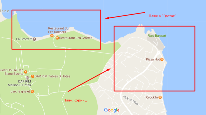 Пляжи в Бизерте находятся в районе Корниш. Я вам не советую их, так как летом здесь собирается очень много людей. Иногда трудно найти свободное место. У них есть и одно преимущество — спуск удобный и пологий, который покрыт белым, мягким песком. Камни кое-где попадаются, но пляж неплохой.