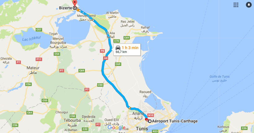 От аэропорта вам нужно проехать через город Тунис и выехать на автомагистраль до Бизерты. Это не сложно сделать — там везде есть указатели.
