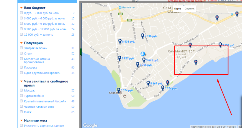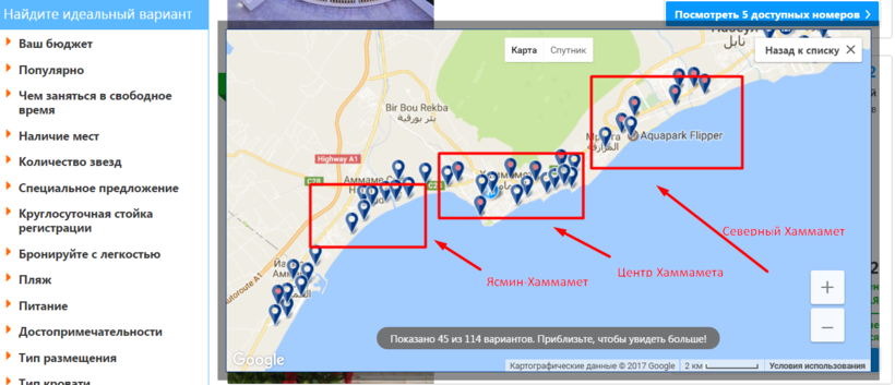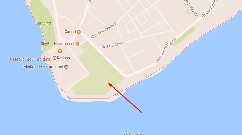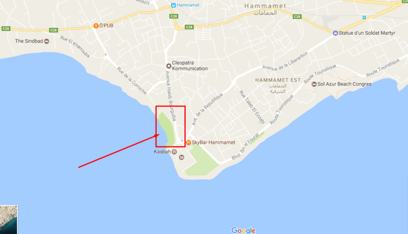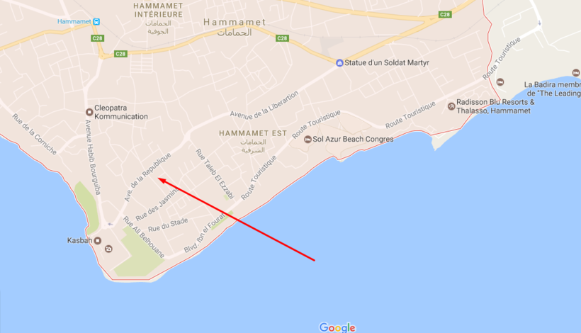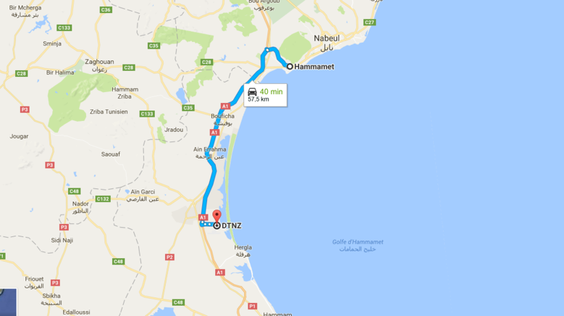 На карте выше показан путь от аэропорта Энфида до Хаммамета.