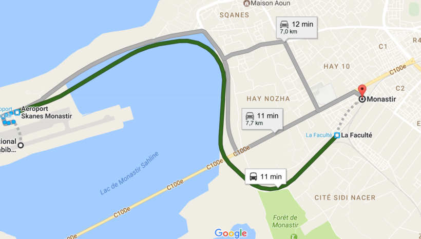 Аэропорт имени Хабибы Бургибы расположился очень близко к городу — всего 10 минут, и вы уже в центре. Доехать от него до города можно на маршрутке (1 EUR) или такси (5 EUR).