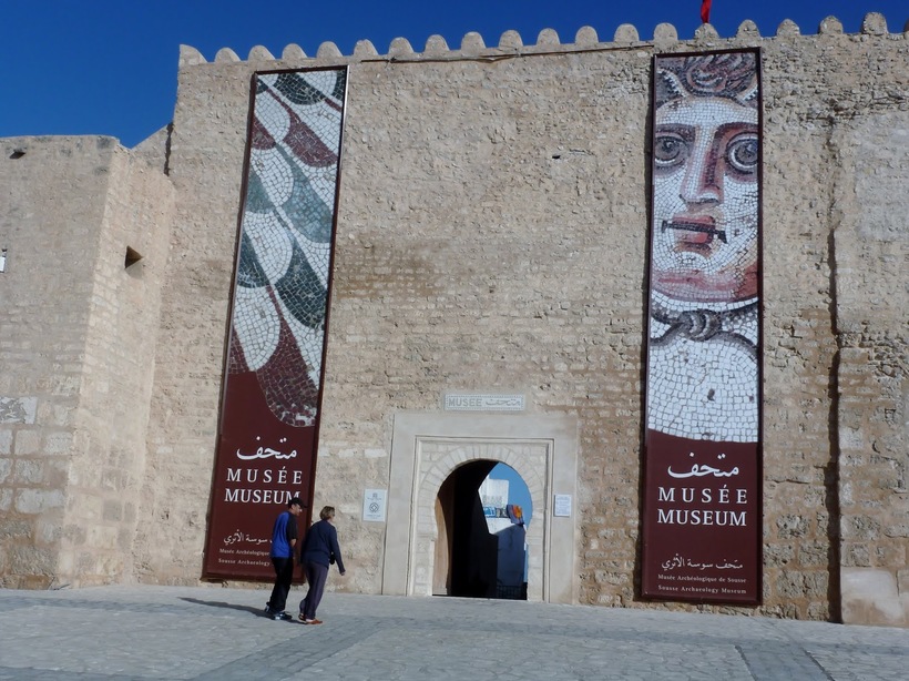 Далее можно отправиться в Касбу (так по-арабски называется цитадель города) — зайти в него можно через Археологический музей. Так, вначале мы осмотрели музей: в нем представлены интересные мозаики времен римского владычества, а также предметы быта первых христиан. Из музея можно выйти во двор Касбы, по которому так приятно спокойно погулять. Там чисто, а вокруг посадили цветы и разные, низкие деревца. Особенно мне понравились виды, которые можно наблюдать с крепостных стен: Средиземное море бирюзового цвета, переливающееся под яркими лучами солнца; крыши маленьких домов Медины, где хозяйки развешивают бельё; и, конечно, марина Сусса, где стоят на якоре многочисленные яхты и катера, также несколько прогулочных, стилизованных под старинные, кораблей, на которых катают в сезон туристов.