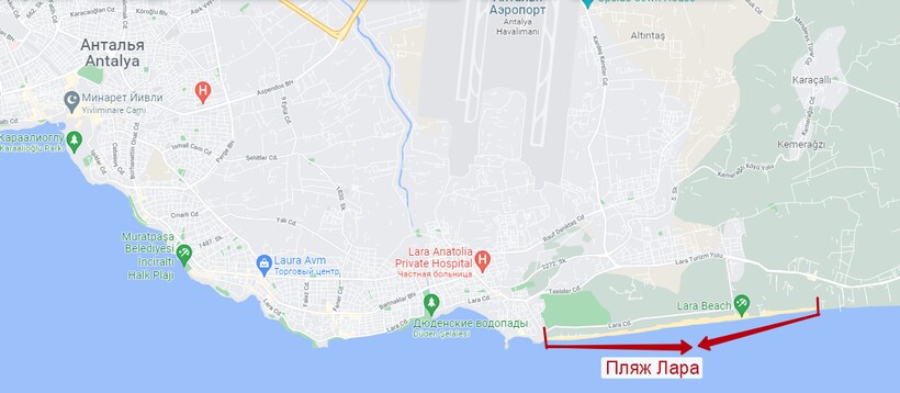 Эта пляжная зона, покрытая чистейшим золотистым песком, расположилась в 13 км от центра Антальи и протянулась вдоль моря на 12 км (от парка Лара Кент до отеля Delphin Imperial). Во многих местах ширина побережья Лары доходит до 30 м.