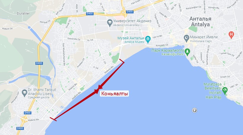 Из центра Антальи к Коньялты можно доехать на автобусах KL06, LF10, из района Лара транспорт курсирует по маршруту LC07.